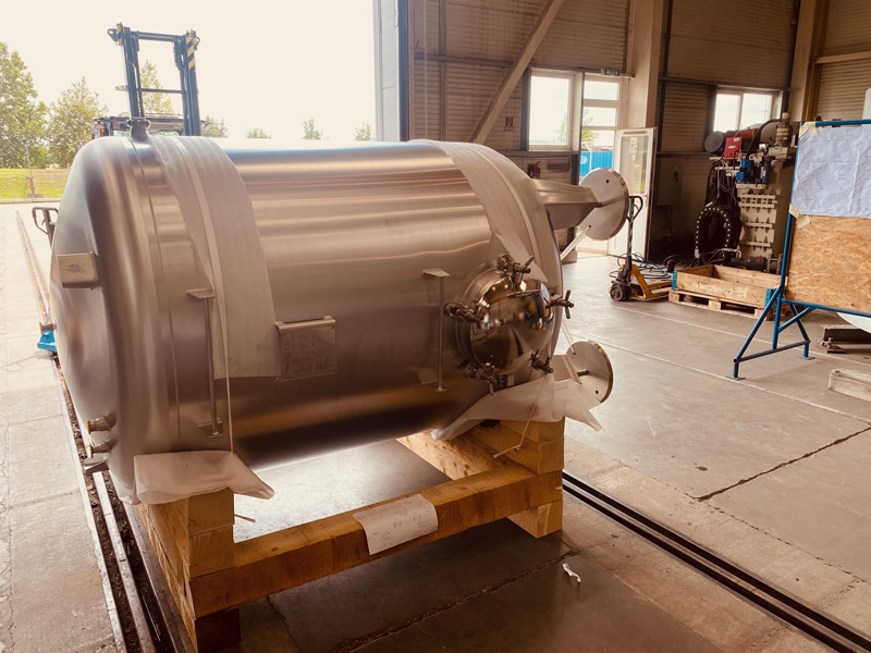 Speciális kialakítású, kúpfenékkel ellátott élelmiszeripari vákuum-szárító készülék. Egyedi tervezésű fedéllel, csigakeverővel és búvónyilással szerelt technológiai tartály.
